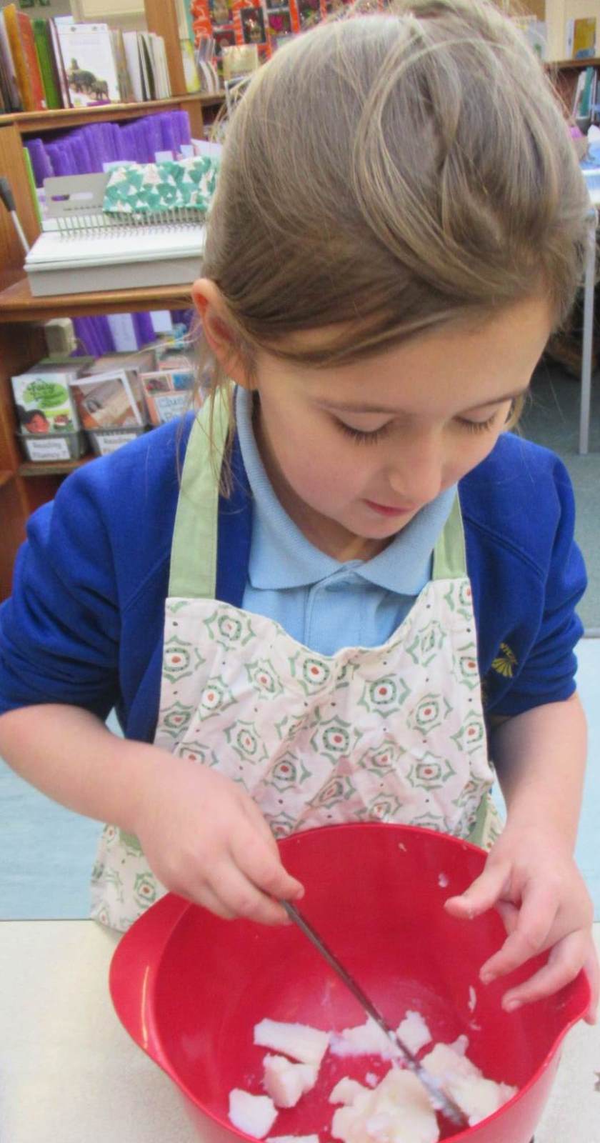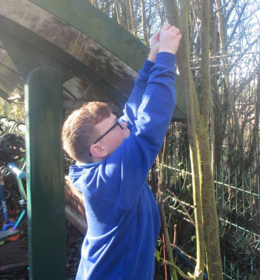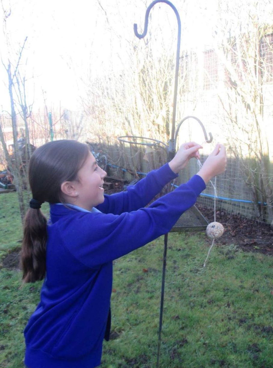 They make bird feeders and hang them on the trees just outside the music room. The children then complete the survey by observing the different types of birds that they see and the results are then sent to RSPB.